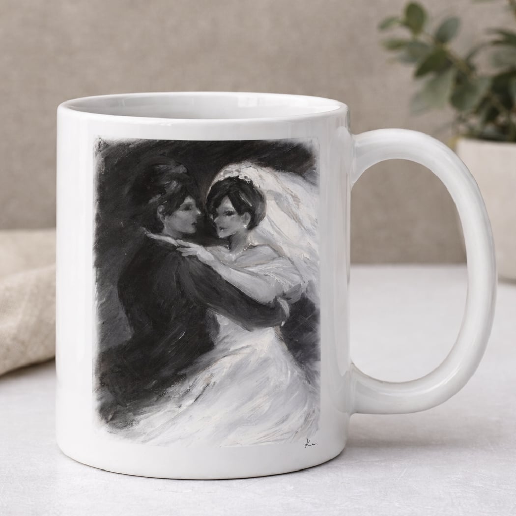 『Monochrome Waltz』アートをプリントしたマグカップ。アートの下にはサインと、裏面にはロゴがあしらわれている特別仕様です。 〈素材〉 陶器 〈SIZE〉 約直径80mm×高さ93mm ※実際の仕上がりとは多少異なる場合がございます。